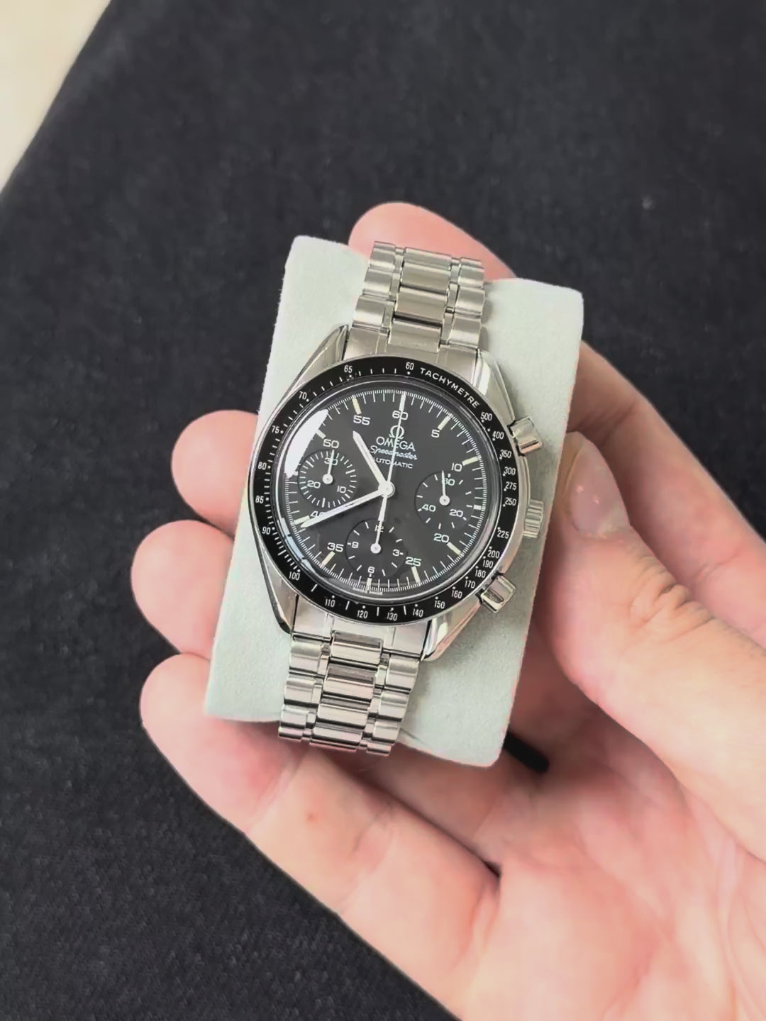 Powered by an automatic movement, this Speedmaster Reduced offers a comfortable watchmaking experience on a daily basis, while retaining the emblematic chronograph function of the collection. It is mounted on its original steel bracelet, completed by a Buckle signed, ensuring authenticity and aesthetic coherence.