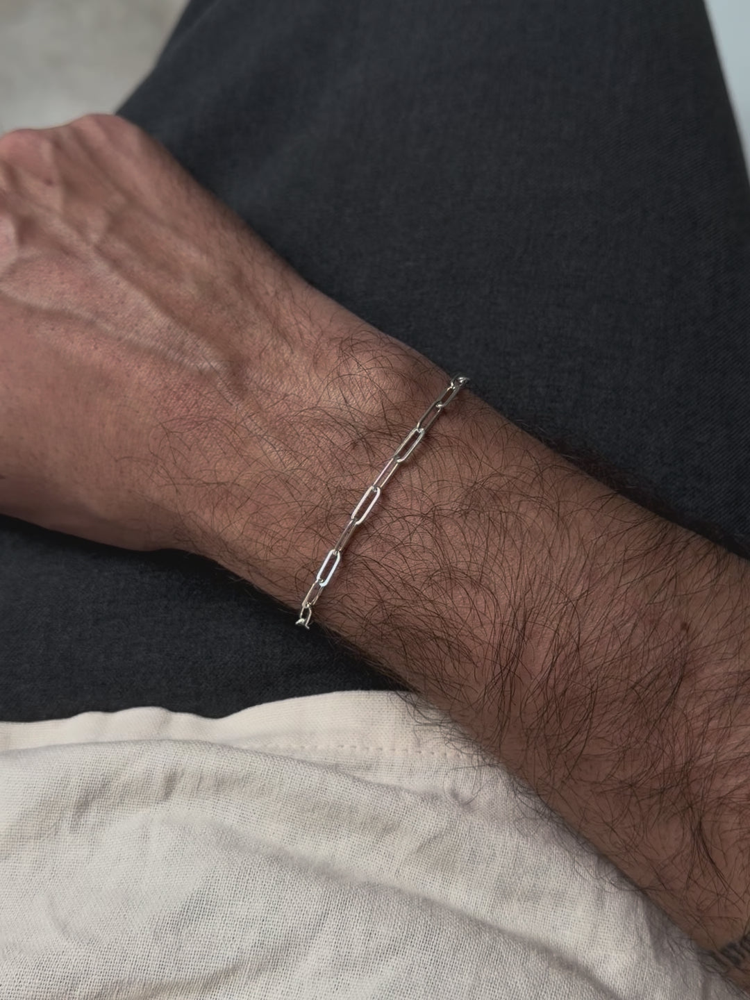 长而几何的链环,形状类似回形针。这是我们系列中最现代和结构化的设计。其简洁的线条使其成为最具潮流的手链,是男士珠宝的新经典。